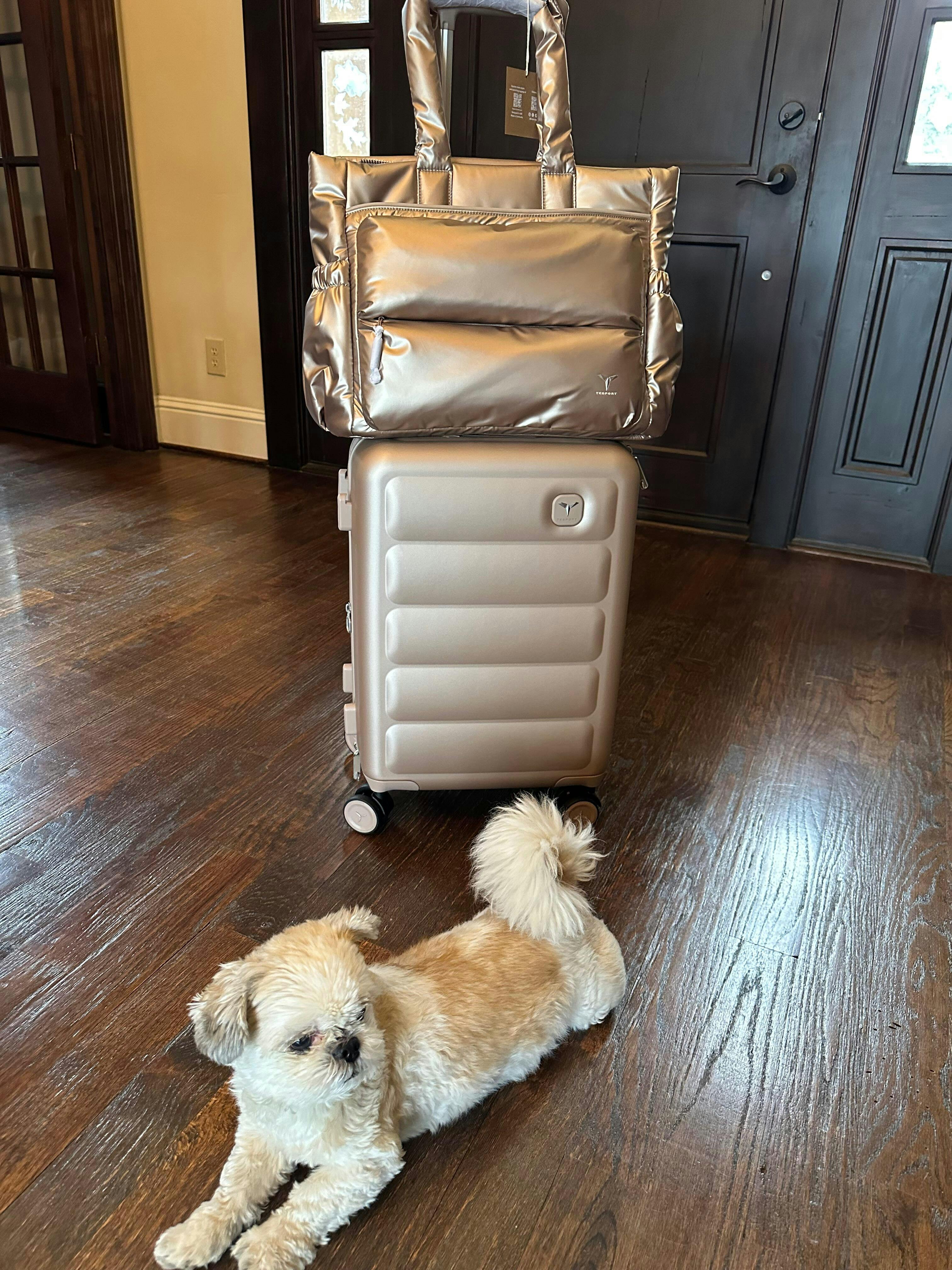 I purchased the Champagne-toned TESPORT tote and carry-on after years of traveling with a Tumi set that had become increasingly frustrating to use. The wheels were rigid and struggled on softer flooring, and the carry-on itself was heavy and cumbersome to lift into overhead compartments.